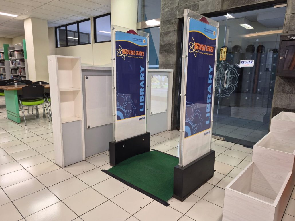 Perpustakaan FK-KMK UGM dilengkapi dengan security gate berbasis teknologi RFID yang terpasang di pintu keluar gedung. Sistem ini berfungsi untuk memastikan bahwa setiap bahan pustaka yang dibawa keluar telah melalui proses peminjaman secara sah. Selain sebagai perangkat keamanan, security gate juga berperan dalam pencatatan data kunjungan pengunjung secara otomatis, sehingga perpustakaan dapat memantau dan menganalisis tingkat kunjungan dengan lebih akurat dan efisien.